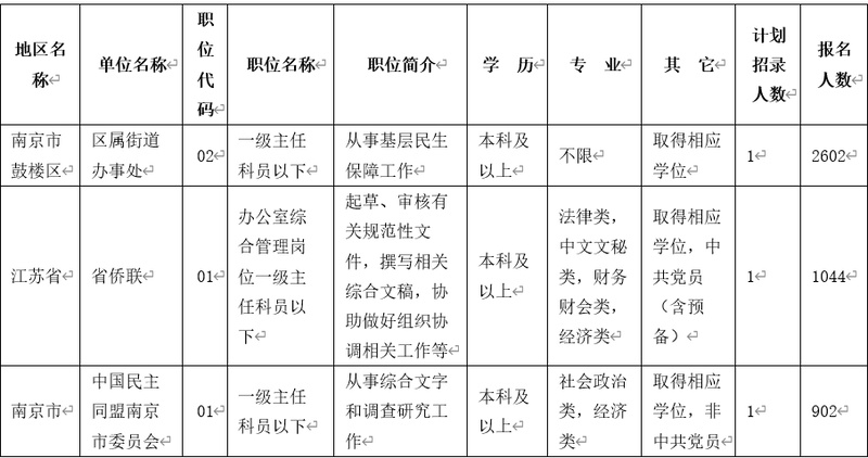 這些崗位對學歷要求均為“本科及以上”,專業不限或涵蓋類型較為寬泛,“其他要求”覆蓋人群較多,工作地點也均為南京,故吸引了眾多考生報考。全省報名人數超過500人的崗位有27個,除省級機關外,南京、蘇州、揚州、泰州、鹽城、宿遷、南通等地區均有涉及,其中南京地區最多,有16個崗位超過500人報考。