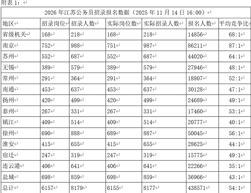 2026年江蘇省公務員招錄於11月14日完成報名及審核工作,盡管今年招錄計劃較去年減少1325人,但綜合報考年齡放寬等因素,報考熱度不降反增。