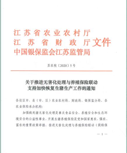为加强病死猪无害化处理,保障食品安全、养殖安全和生态环境安全,1月20日,江苏省农业农村厅、江苏省财政厅、中国银保监会江苏监管局联合下发通知,从今年起,各地对病死猪进行工厂化、专业化处理方式——集中无害化处理。