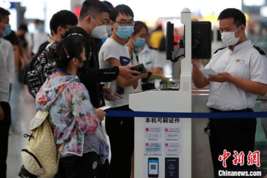 家长带着孩子在铁路上海虹桥站等待验票上车。 殷立勤 摄