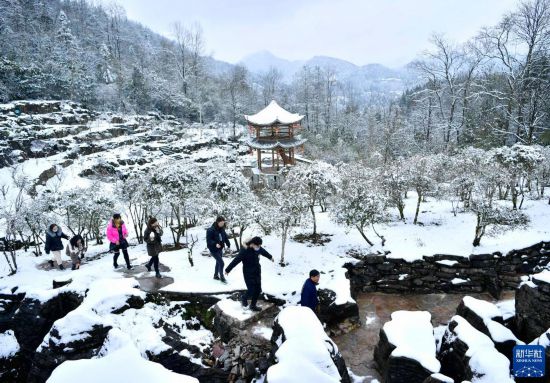 1月29日,游客在湖北省宣恩县锣圈岩地质公园里踏雪游玩。