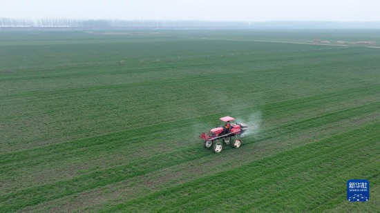 2月11日,在江苏省淮安市洪泽区三河镇,农民驾驶农机给小麦施肥(无人机照片)。