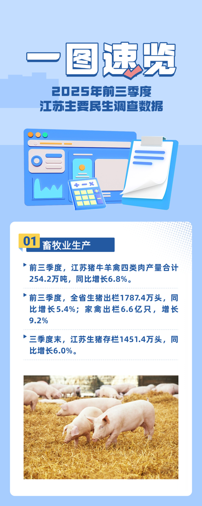 11月3日,新华日报·交汇点记者从国家统计局江苏调查总队获悉,前三季度,江苏民生保障扎实有力,重点领域呈现稳好态势:秋粮生产基础总体良好,旱粮玉米丰收基本定局,水稻苗情长势总体优于去年同期;畜禽生产平稳推进,存出栏量持续增长,为全省民生“基本盘”注入稳稳底气。具体数据如何,请看长图。