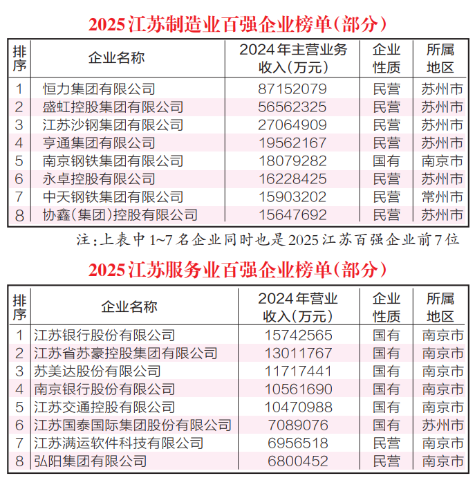 记者从江苏省企业联合会获悉,11月5日,2025江苏企业排序前100家榜单(简称“百强”)、制造业企业排序前100家榜单(简称“制造业百强”)、服务业企业排序前100家榜单(简称“服务业百强”)三张榜单出炉。省企业联合会表示,2025江苏百强企业呈平稳发展态势,其经济运行实现总量小幅增长、结构持续优化、创新动能增强的发展特点。