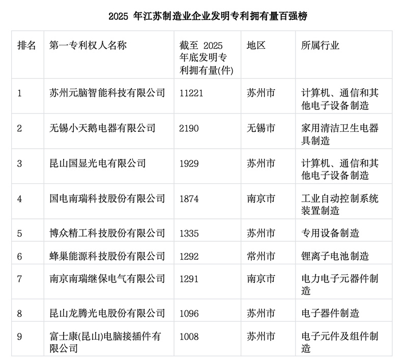 收藏原题:9家企业均超千件!2025年江苏制造业企业专利百强榜出炉